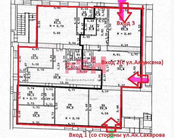 -Три входа: один с ул. Ак. Сахарова, второй с ул. Амундсена и третий со двора;