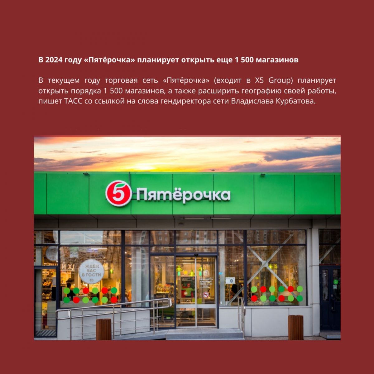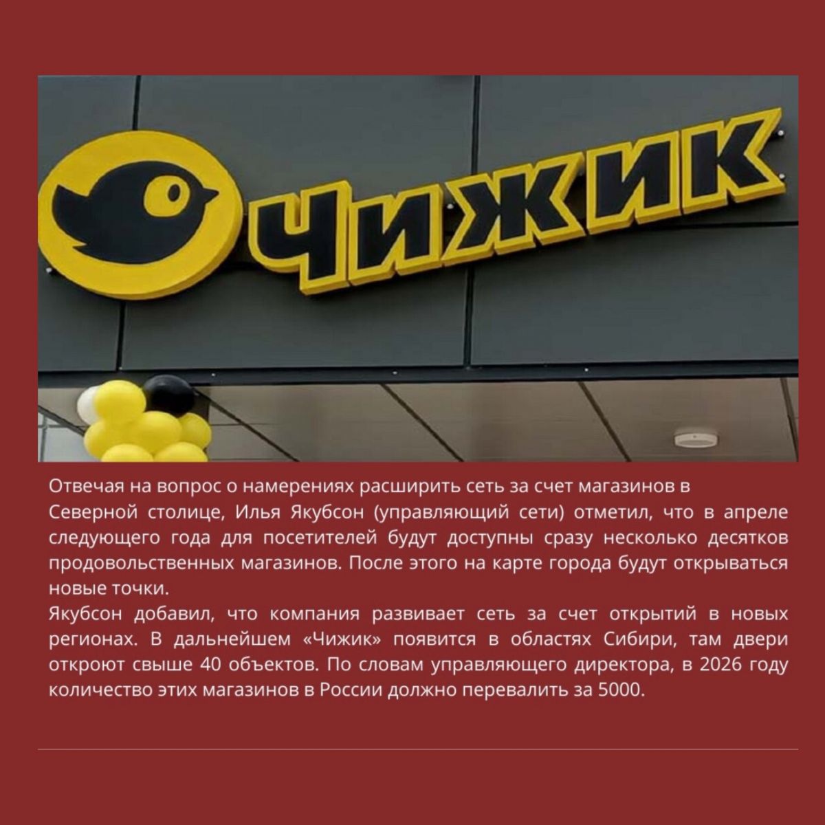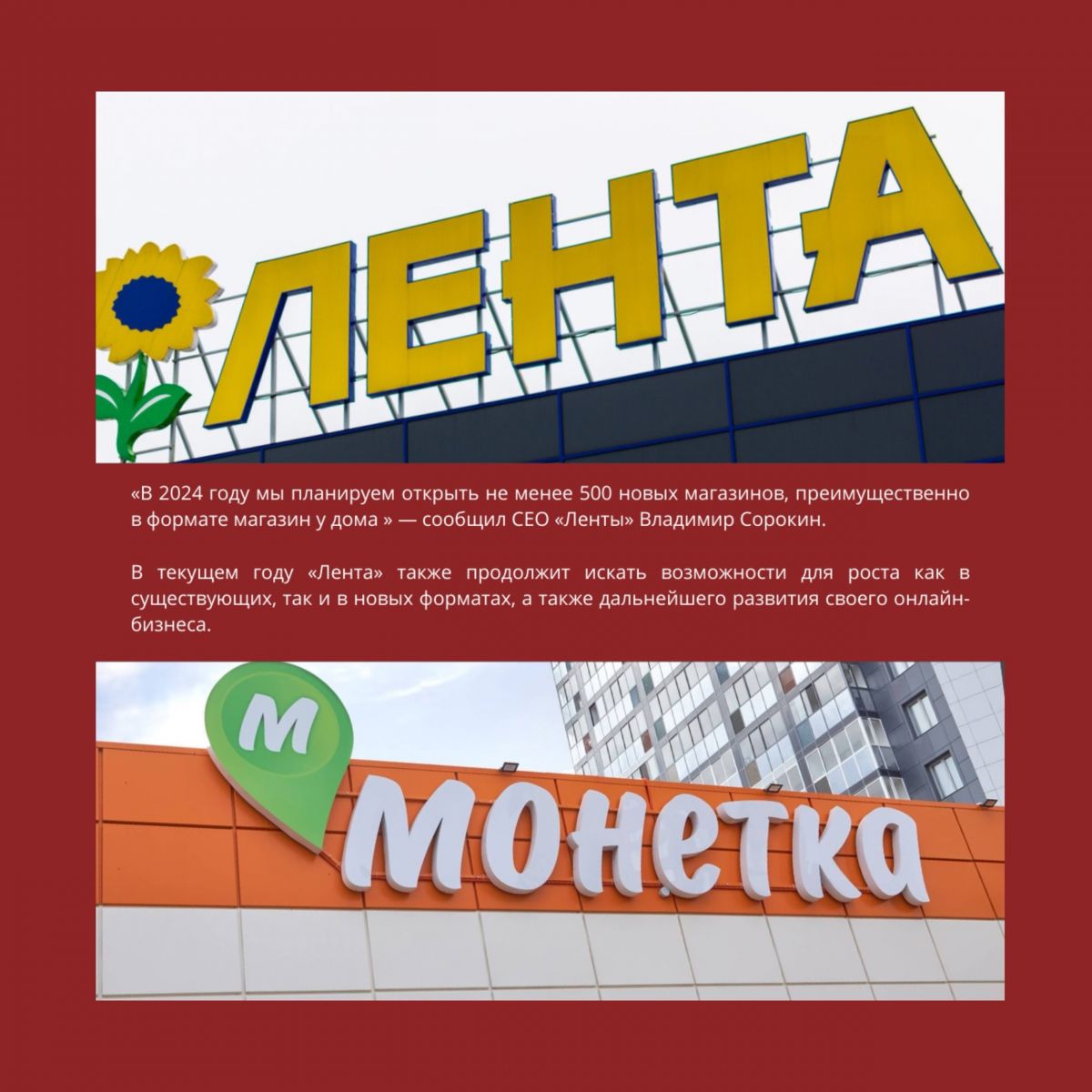 На фото в карусели вы можете увидеть, какие планы у крупных сетей «Чижик», «Лента=Монетка», «Пятёрочка».